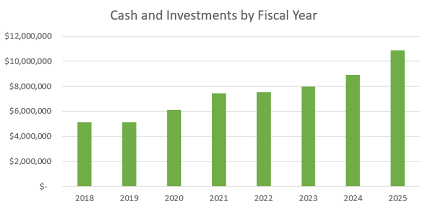 DHIN maintained cash and investment balances as of June 30, 2025 and 2024, totaling $10,891,667 and $8,898,497, respectively which represents a 111% increase from the Fiscal Year ended June 30, 2018.